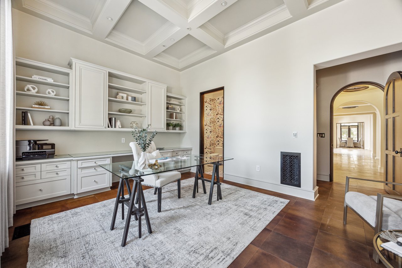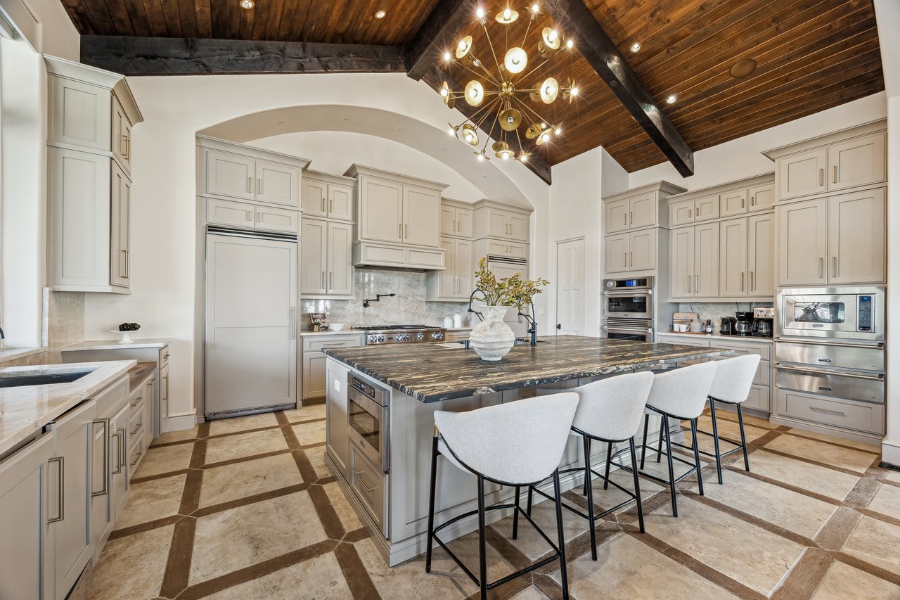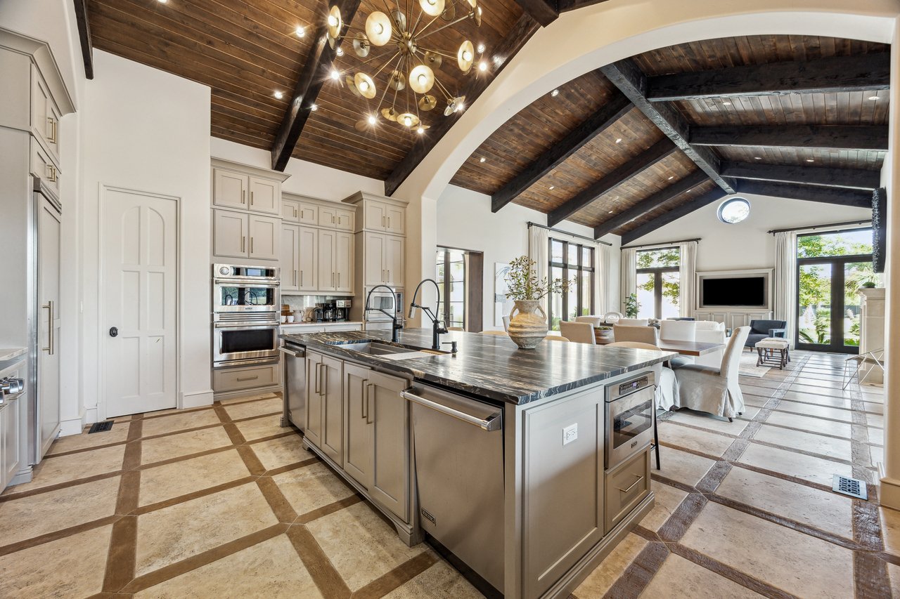 A wine connoisseur’s dream, the estate includes a temperature-controlled wine cellar with capacity for 1,500 bottles, including dedicated magnum storage. The chef’s kitchen boasts professional-grade stainless steel appliances, seamlessly connected to a vaulted family room, offering bold design and ultimate functionality.