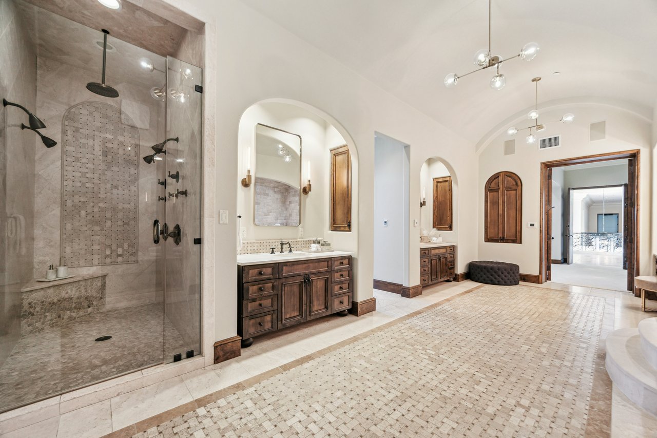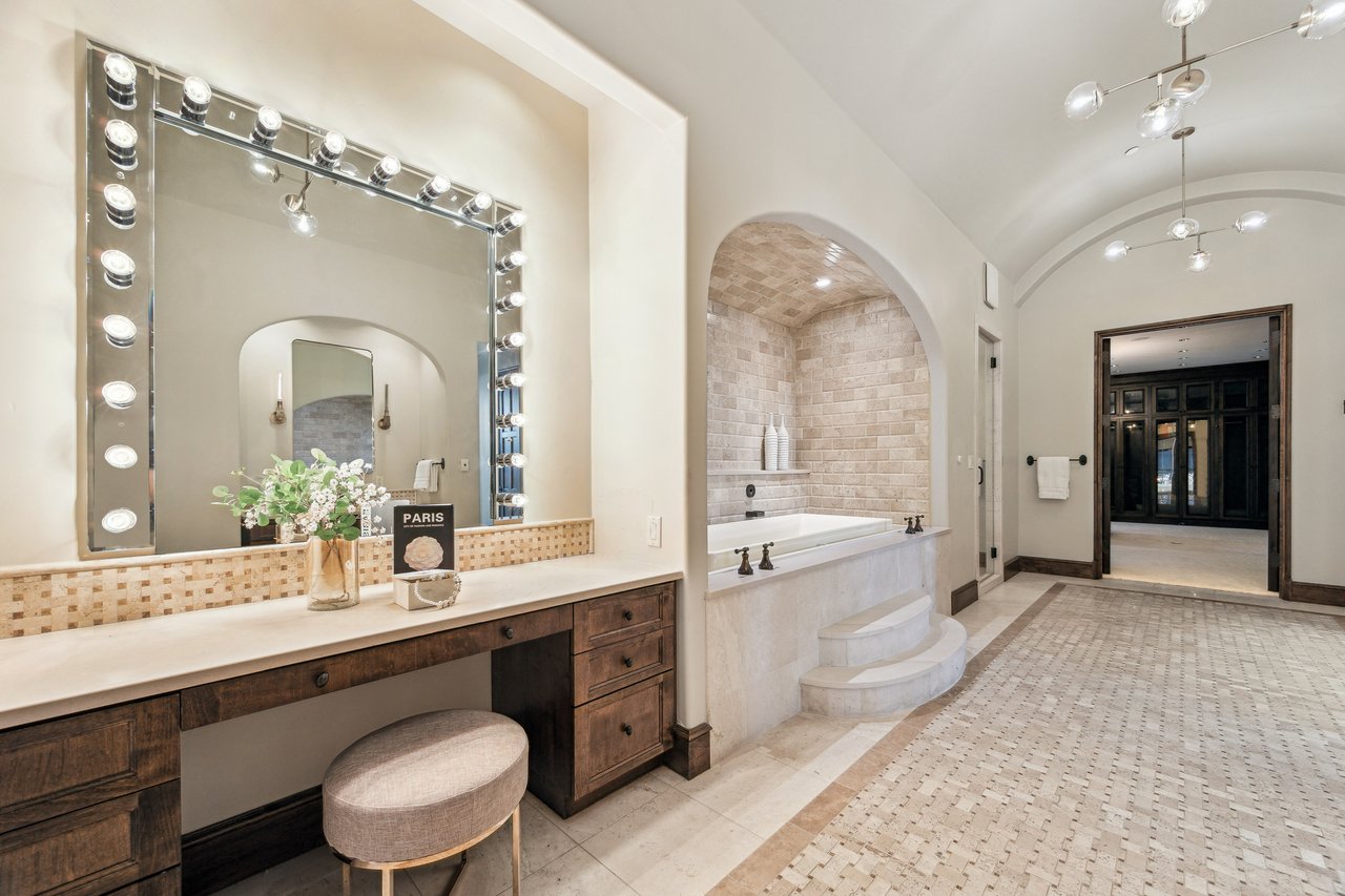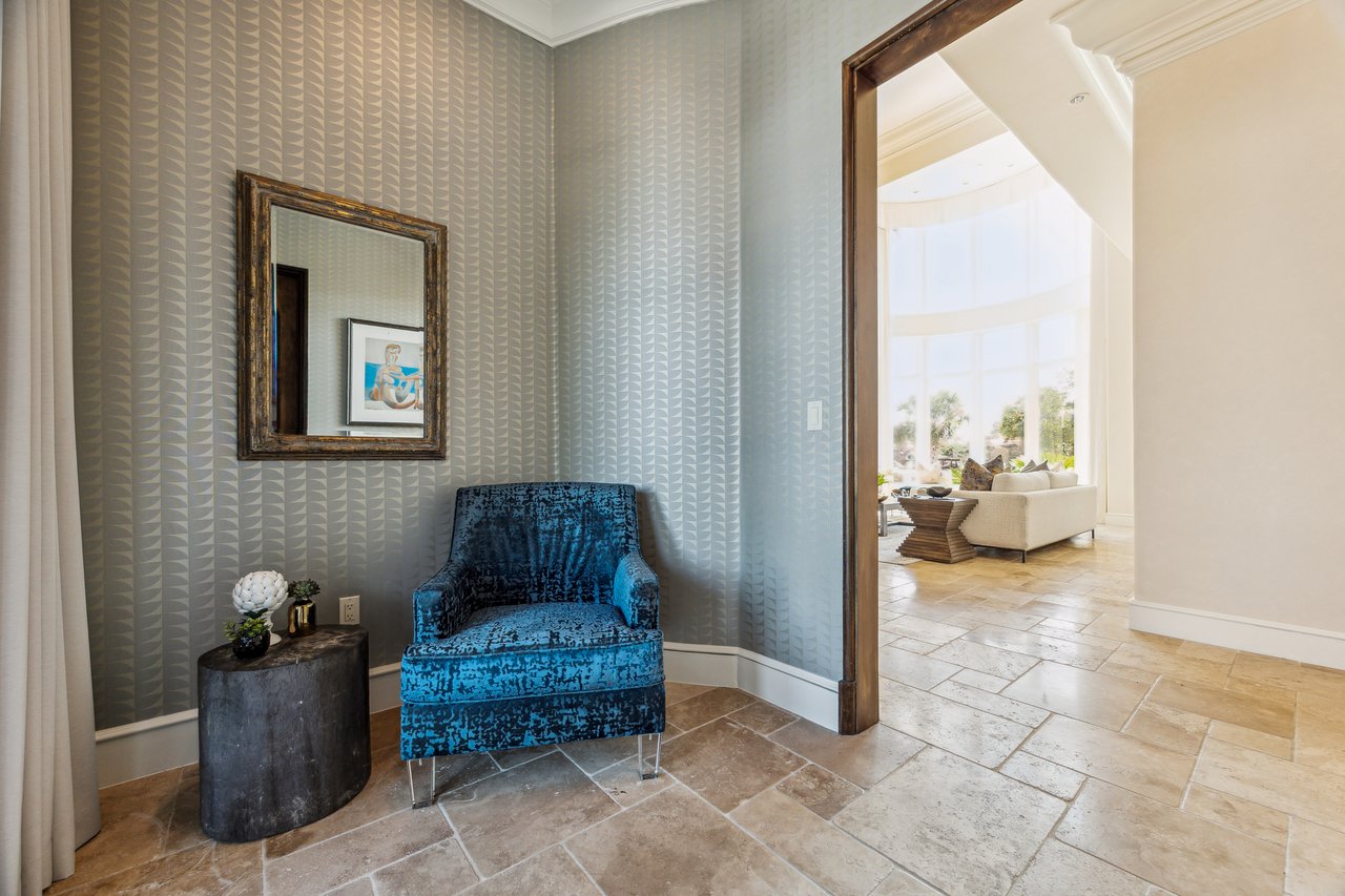 The primary retreat is a haven of luxury, complete with a private sitting area, spa-inspired bath adorned in marble and travertine, and a custom walk-in wardrobe with extensive built-ins. The main residence includes five additional spacious guest suites, two private home offices, and a true theater room with tiered stadium seating.